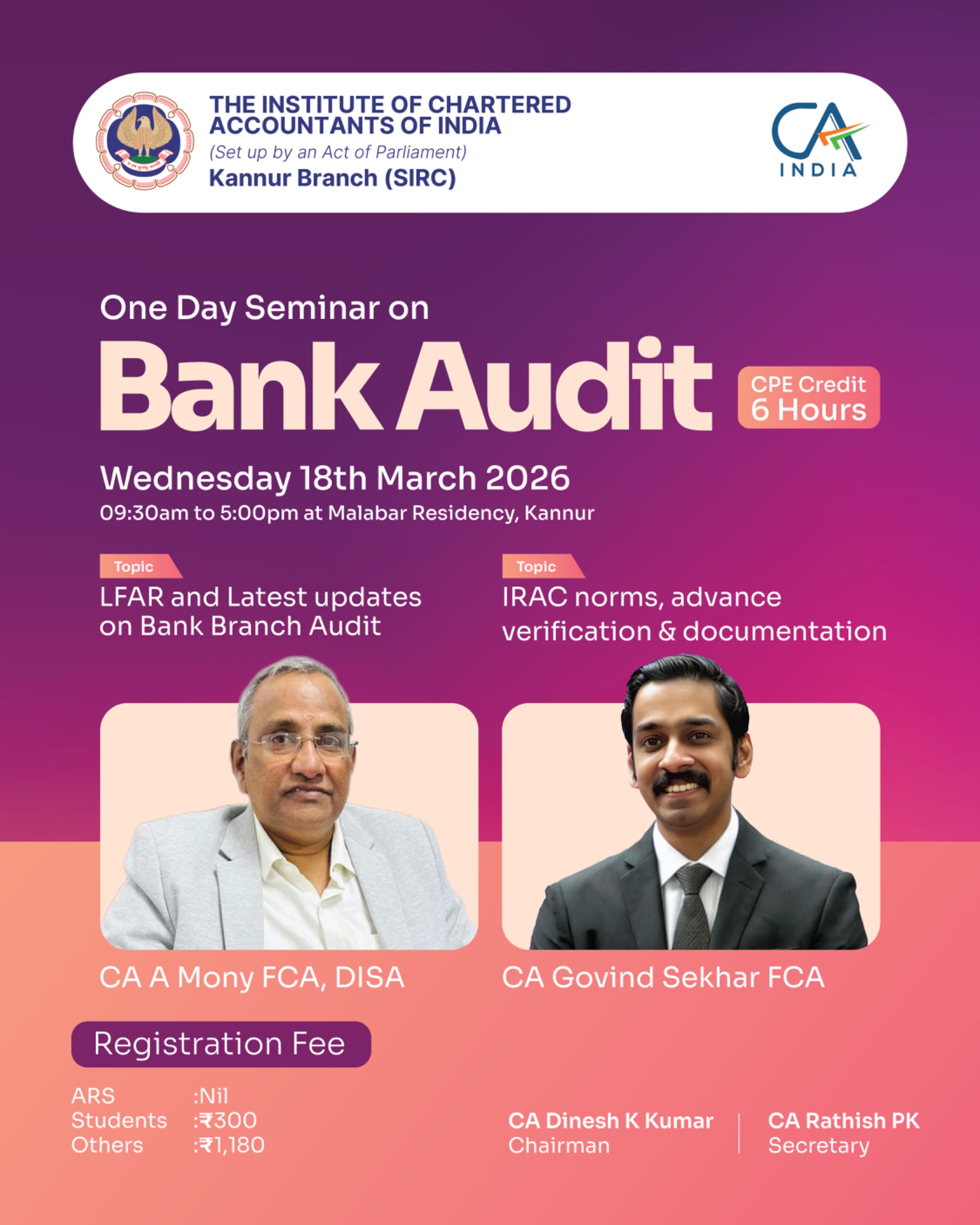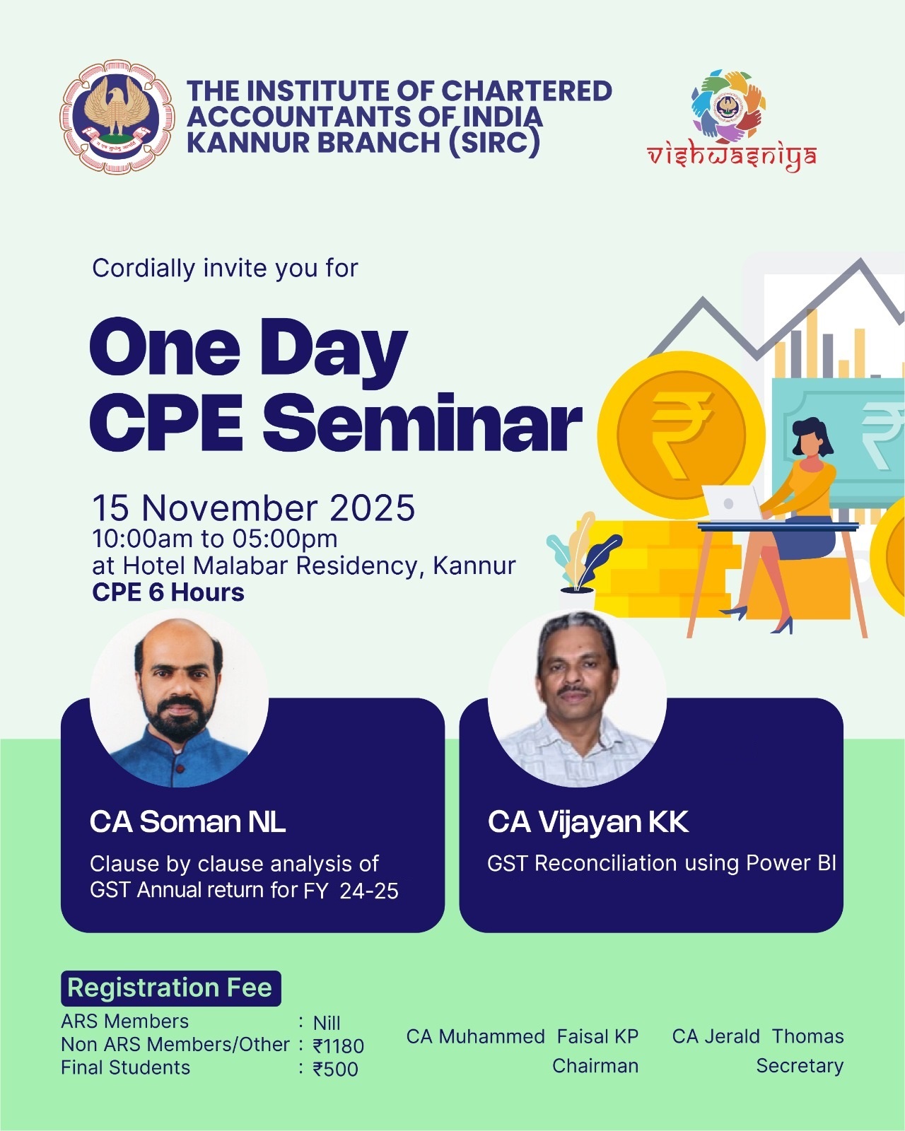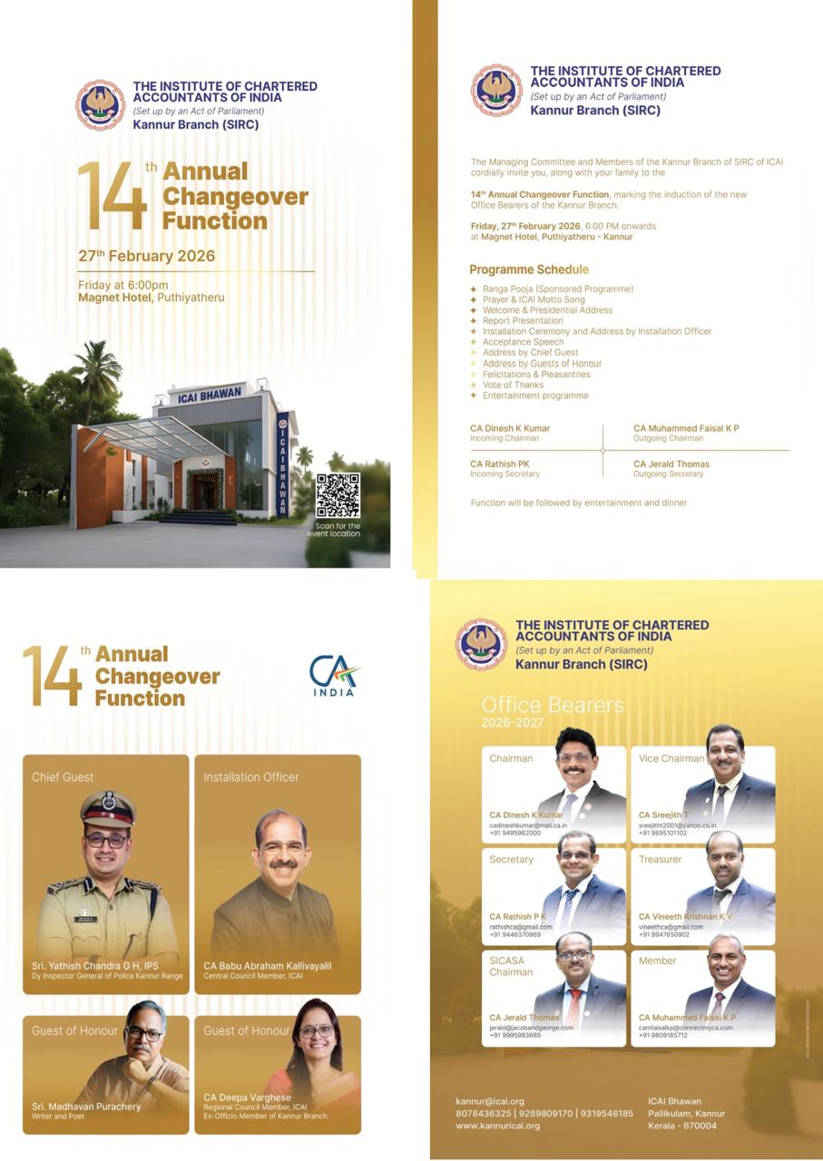 The Institute of Chartered Accountants of India (ICAI) is a statutory organisation formed by an Act of Parliament, namely the Chartered Accountants Act, 1949 (Act No. XXXVIII of 1949), to regulate and develop the profession of Chartered Accountants in India. The Kannur Branch of the ICAI is focused on its regulatory and developmental function, which establishes the highest professional and ethical standards for its members in the Kannur district. The unit strives to enhance facilities accessible for education, training, continual knowledge updating, and research and development.